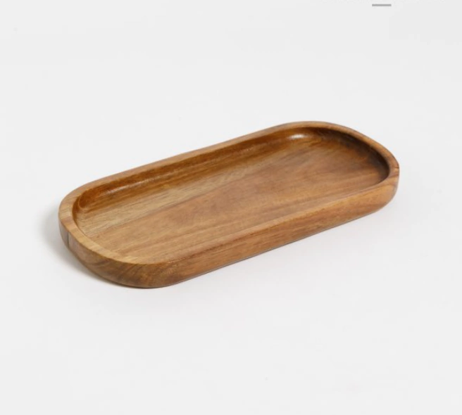 Esta elegante bandeja de acacia combina funcionalidad con un diseño encantador.