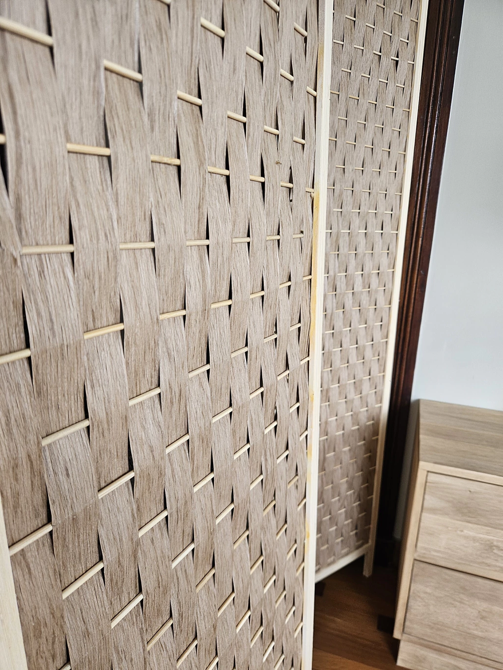 Agregá calidez y privacidad a tus espacios con este biombo de madera y cinta de kraft. Con un acabado rústico y realizado en madera natural, cada panel es único, mostrando vetas y texturas propias del material. Ideal para dividir ambientes o decorar, suma un toque artesanal a tu hogar. Medidas aproximadas: 180x180 cm.