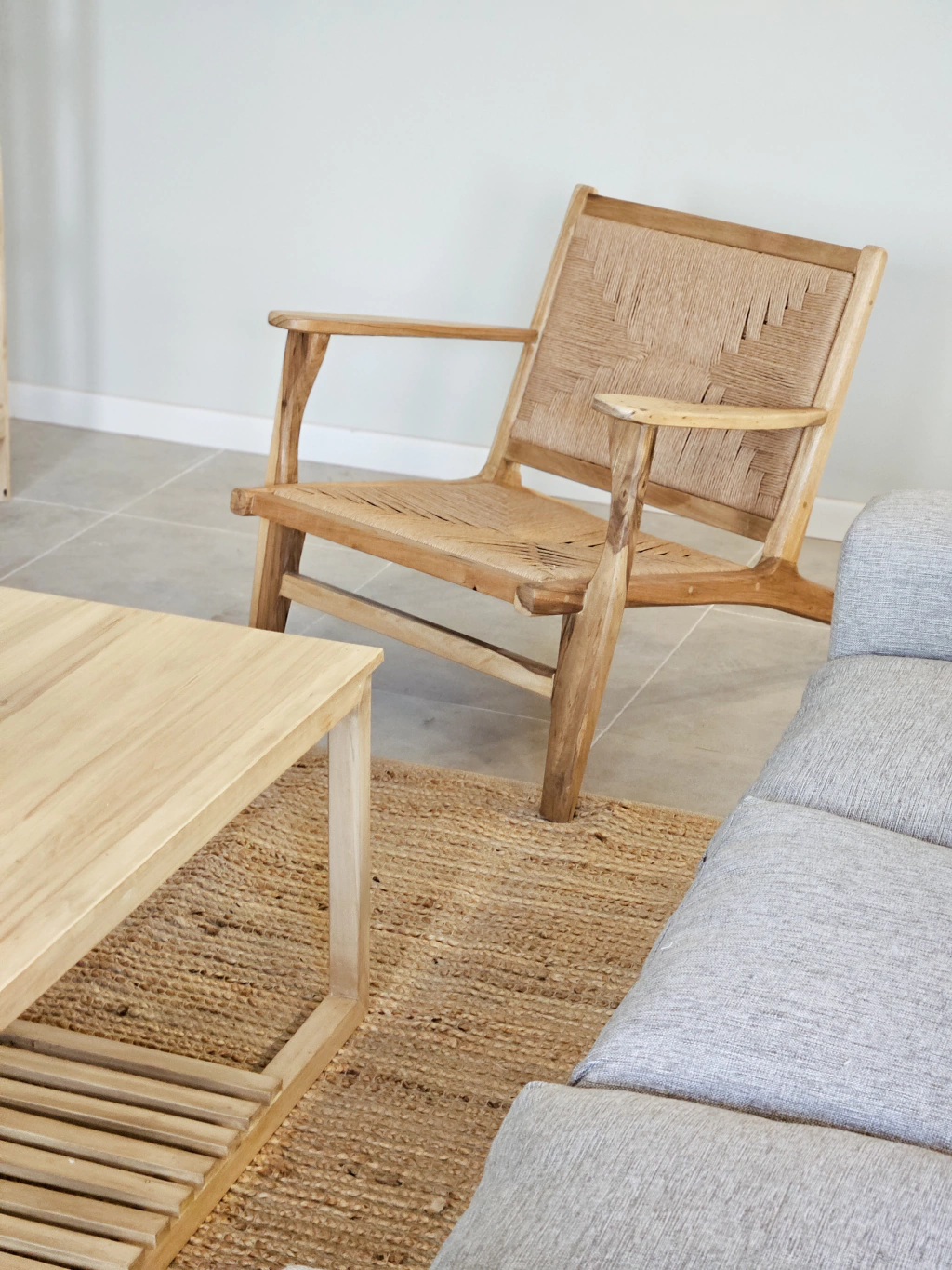 Poltrona realizada en madera Petiribi, con terminación de hidrolaca semi-mate, el asiento es tejido a mano con papel Kraft.